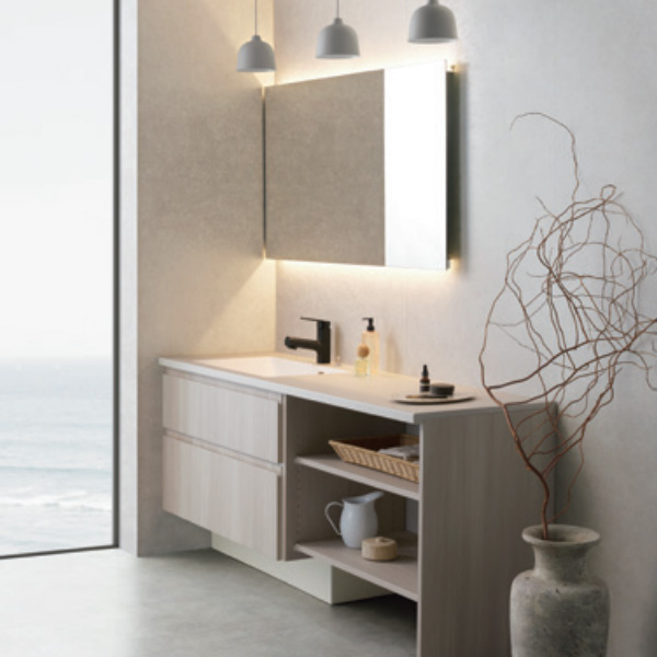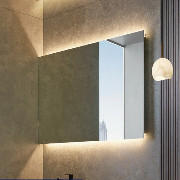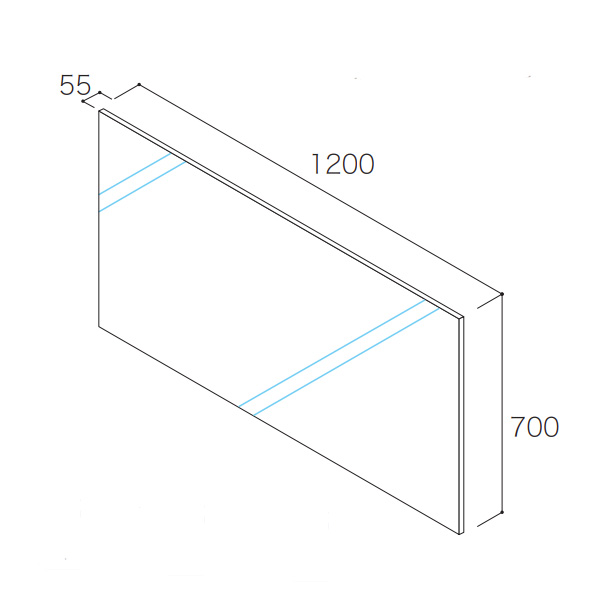 スクエアタイプの間接照明付きミラー。W1200×H700×D55mmのフレームレスが美しいデザイン。まわりのテクスチャーを優しく照らしさらに雰囲気のある空間へ。